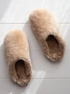 Luxurious slip-on real sheepskin slippers in a soft pale caramel colour. With comfortable sheepskin outer and  insoles, with waterproof rubber soles. These are super warm and easy to slip on.